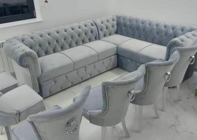Naroznik w chesterfield głęboko pikowany 300x220 bez f spania, z nogami chromowanymi tulejkami, kryształki pinezki do ...